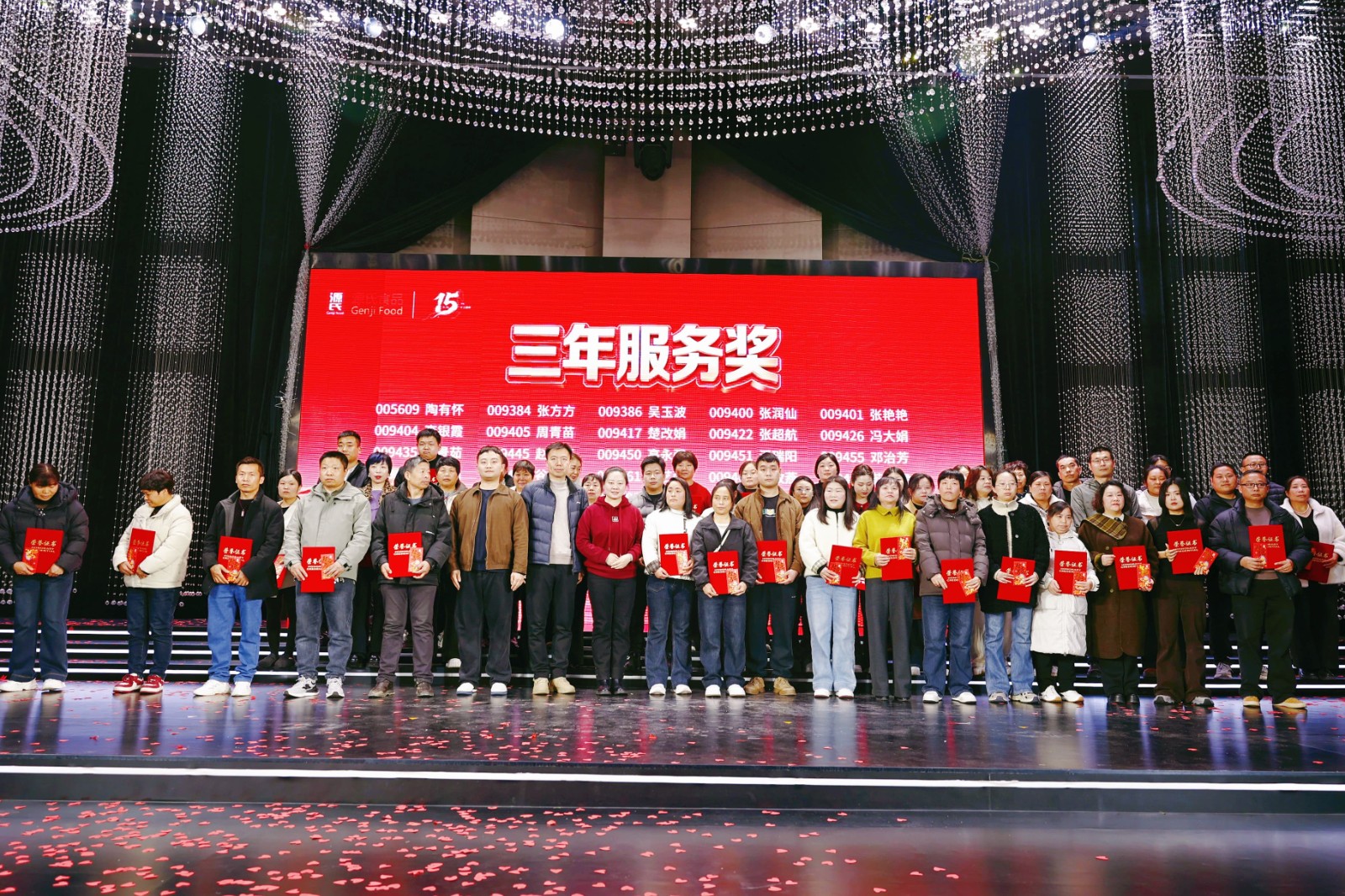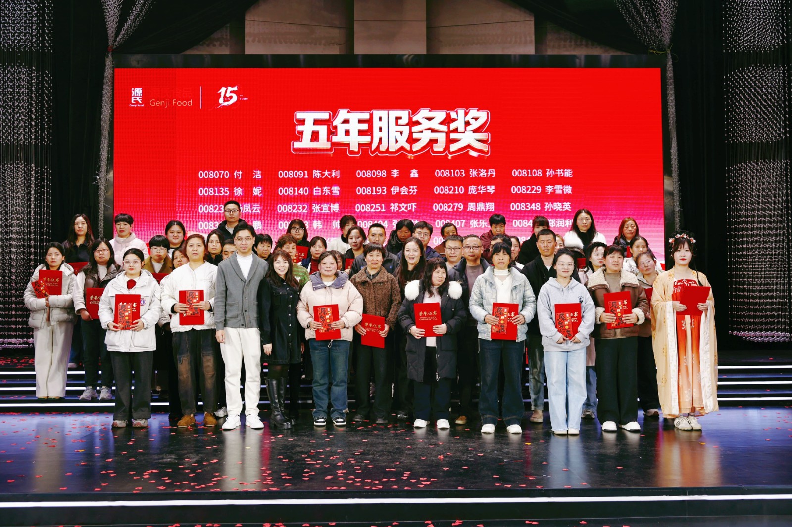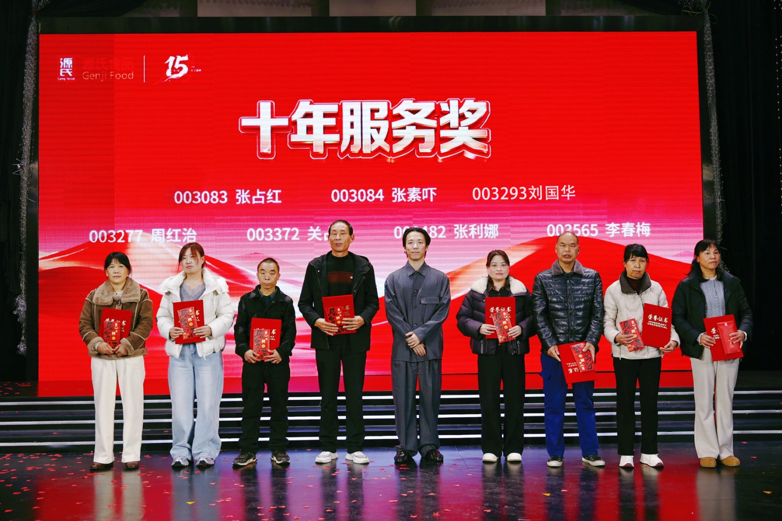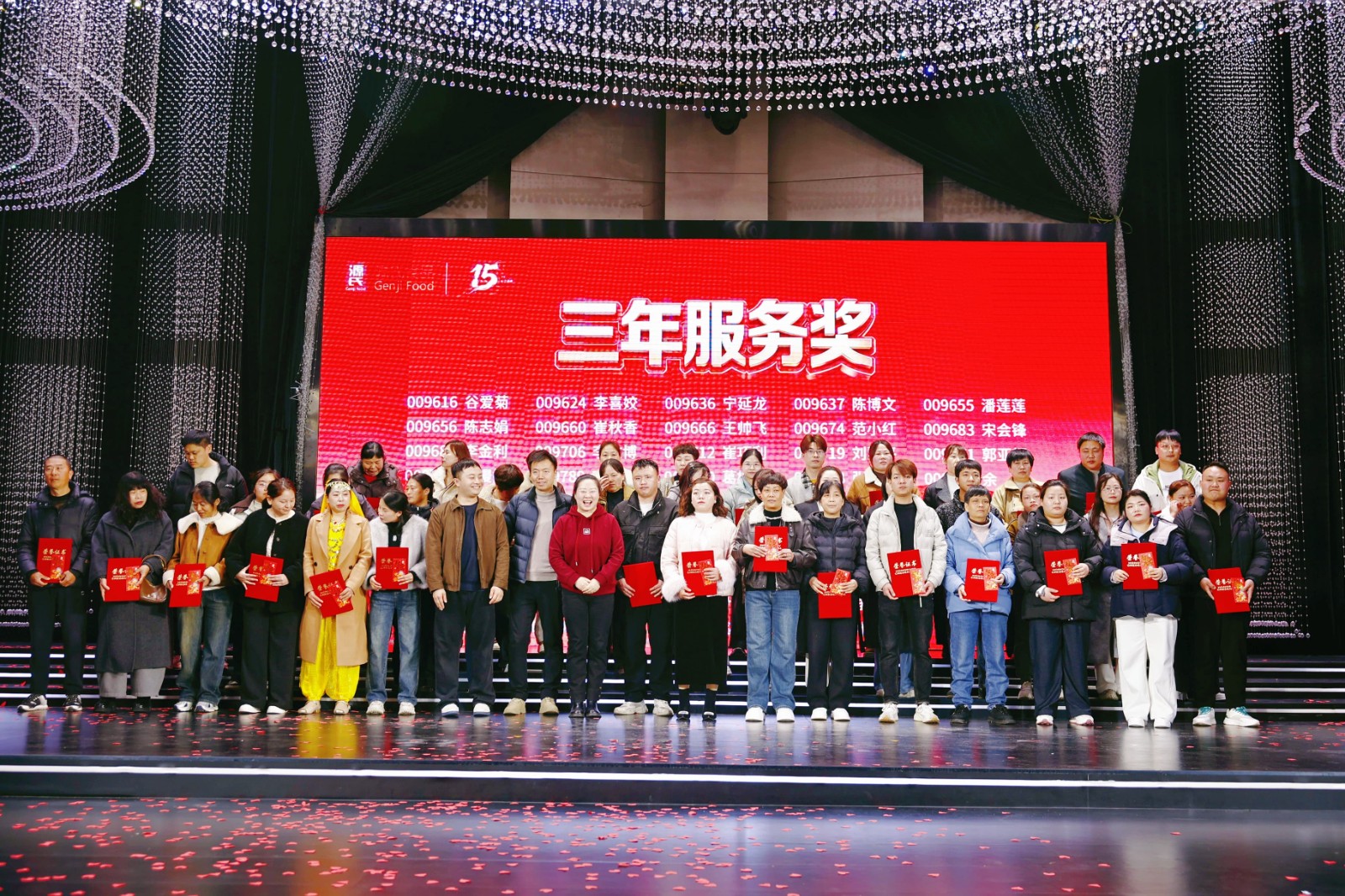 盛典现场对公司新锐奖、优 秀员工奖、优 秀管理干部奖、优 秀团队奖等多个奖项进行表彰,为3年、5年、10年乃至15年资 深员工颁发服务奖,品控部阳述东经理获颁专属的十五年服务奖。每一份荣誉都是对新香蕉视频在线观看人实干与坚守的肯定。